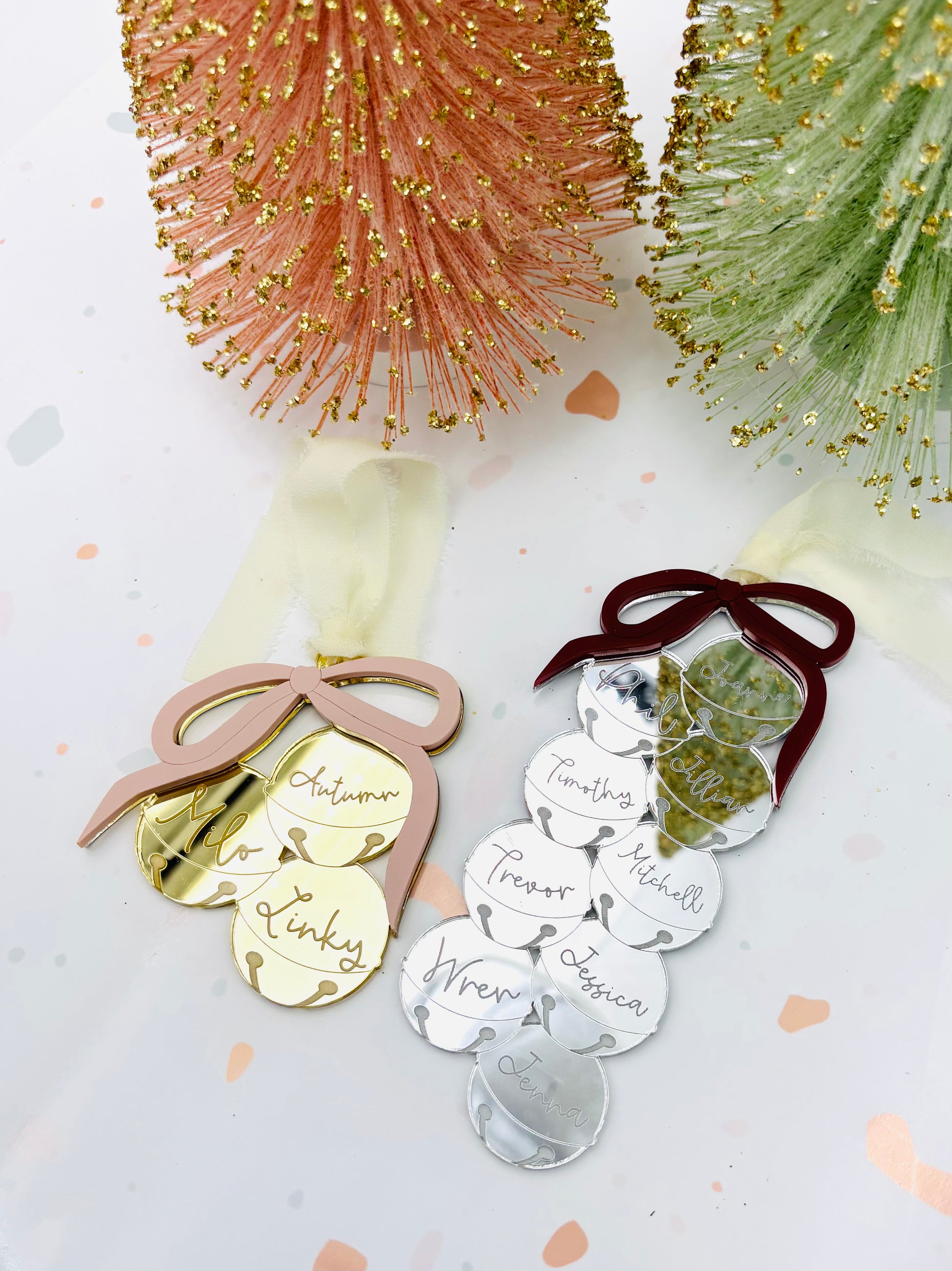 This charming ornament features a cluster of bells tied together with a festive bow, each bell engraved with a family member’s name. Whether you have one name or a whole crew of ten, it’s a beautiful way to capture your family’s holiday spirit.