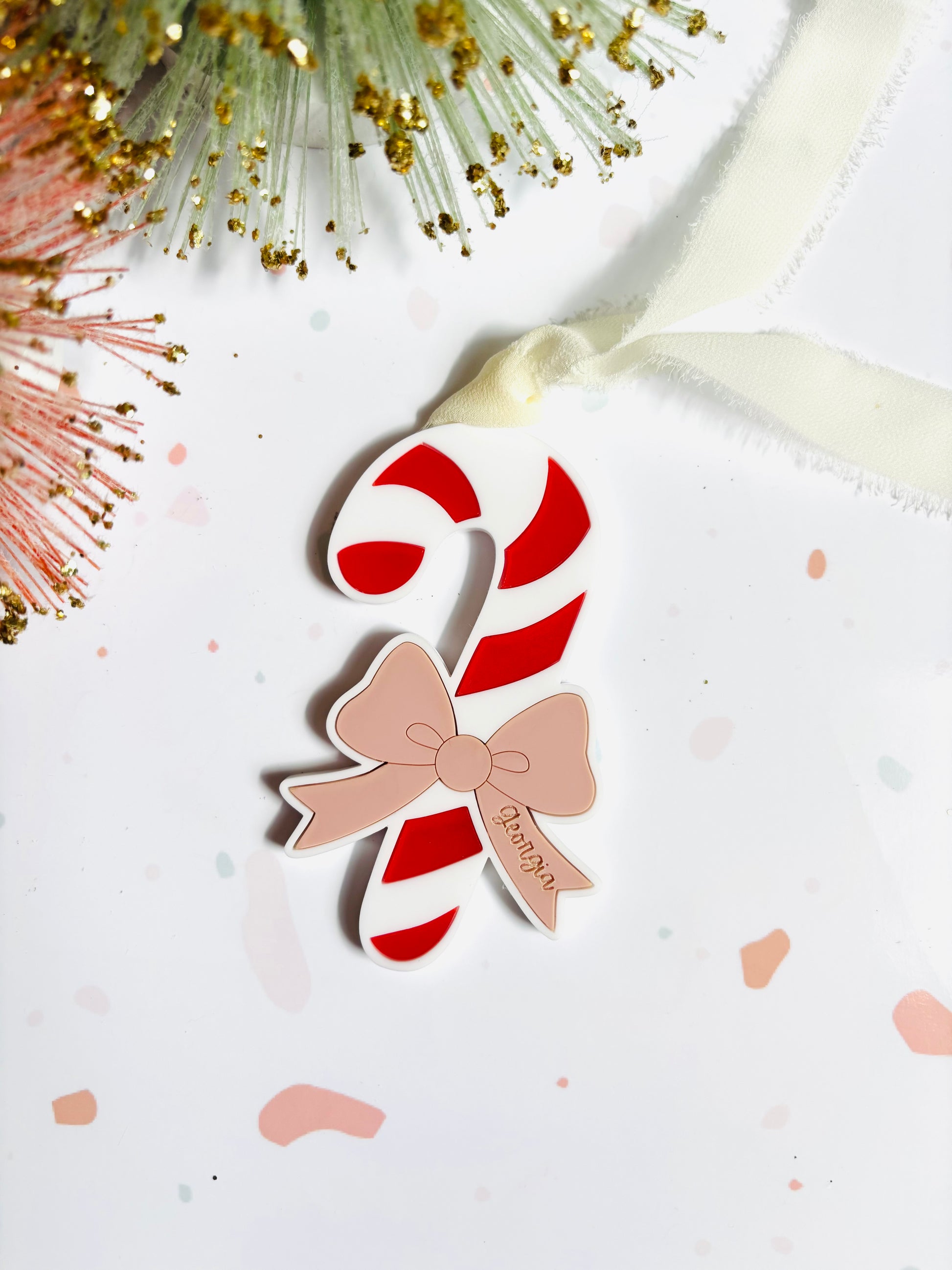 Take your holiday decor to the next level with this cute candy cane ornament or stocking tag! Crafted from acrylic, each tag has two layers with a bow that can be customized with your choice of name.