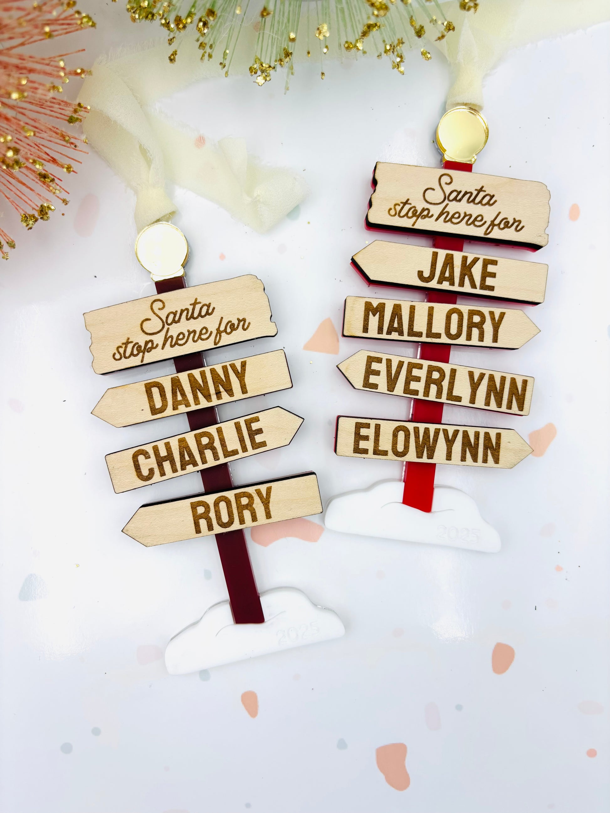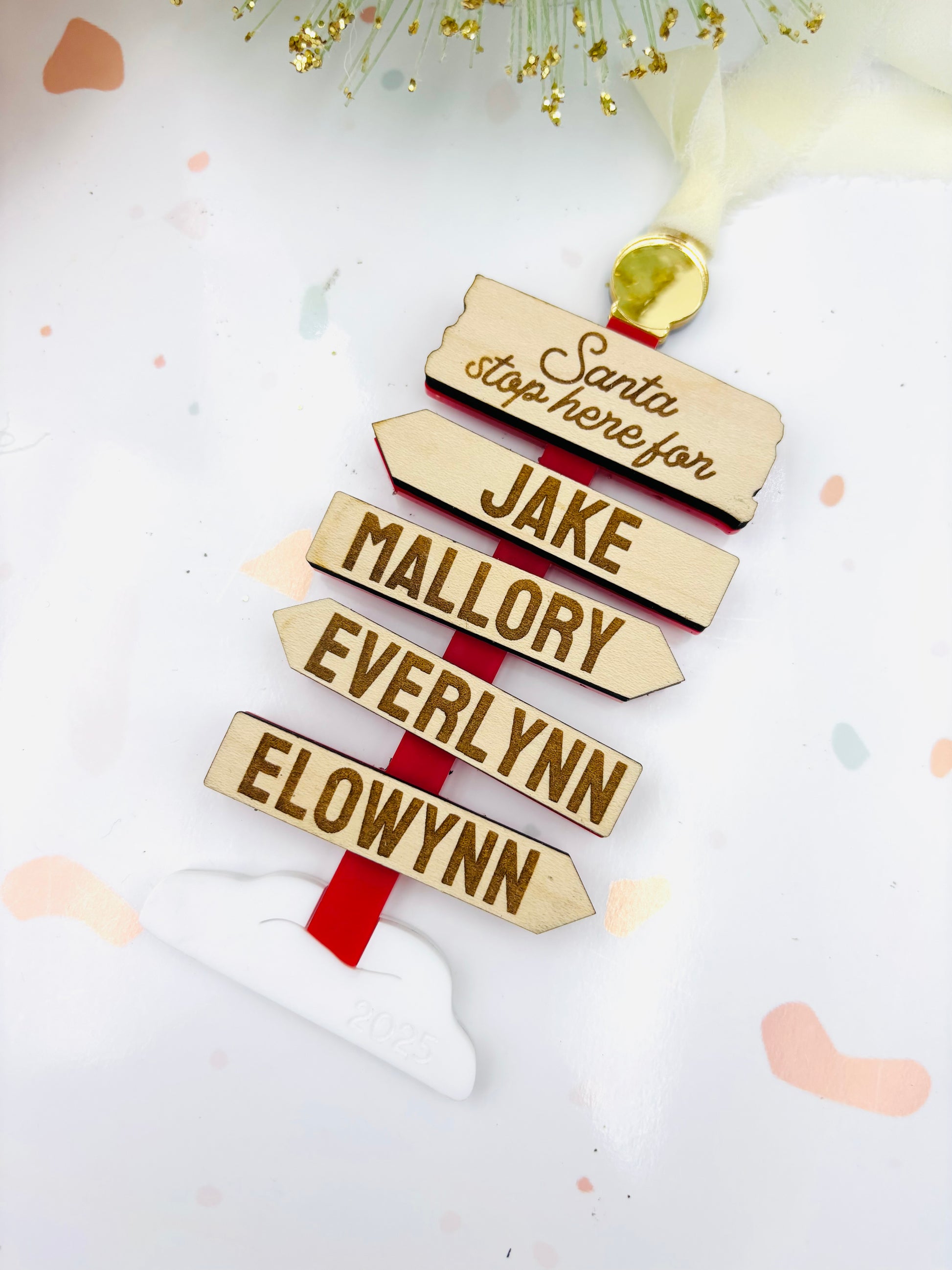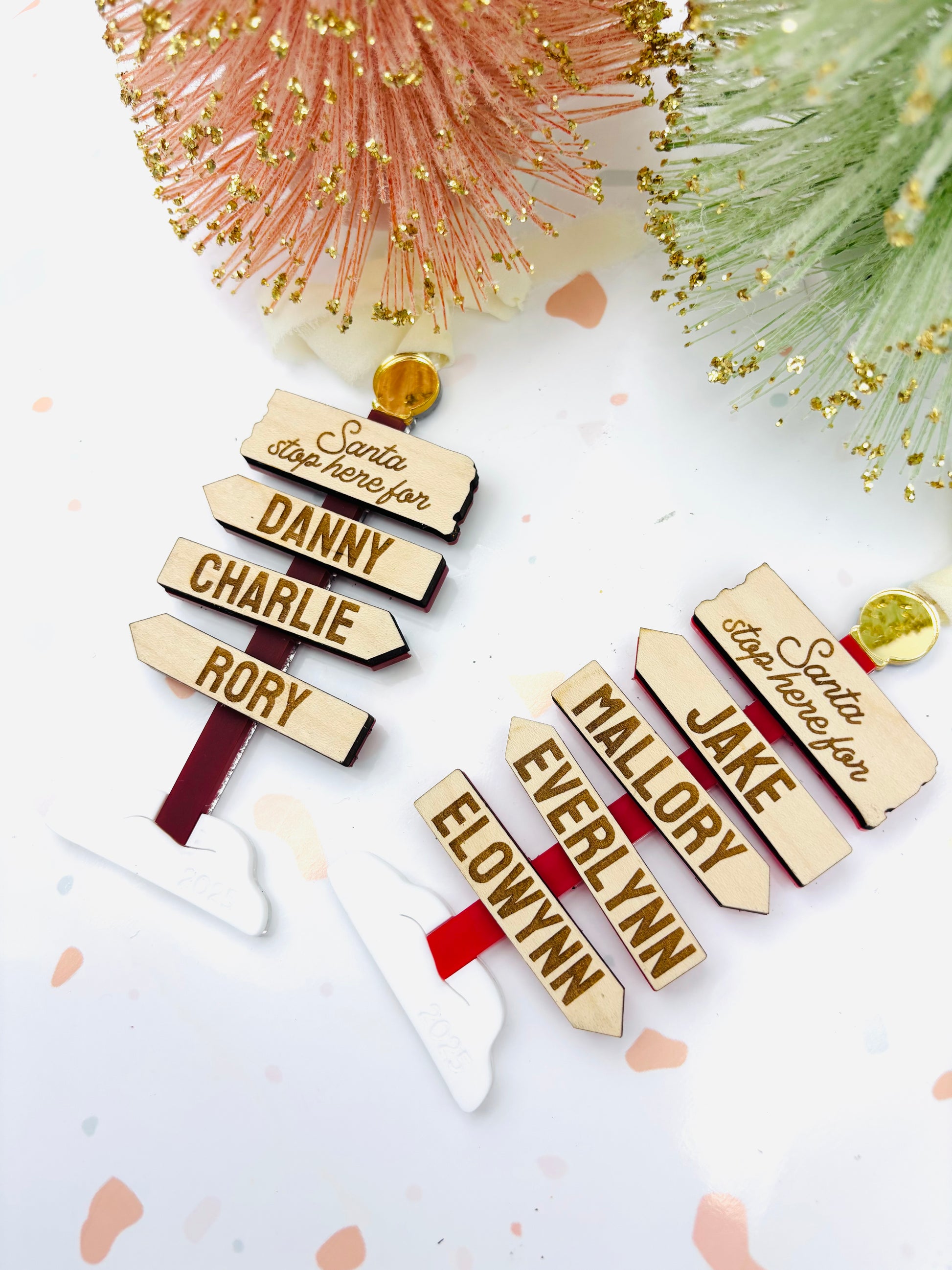 This adorable ornament reads “Santa Stop Here For…” followed by your family members’ names — personalized just for your household. Whether it’s one name or a full list of little believers, this piece adds a playful and heartwarming touch to your holiday decor.